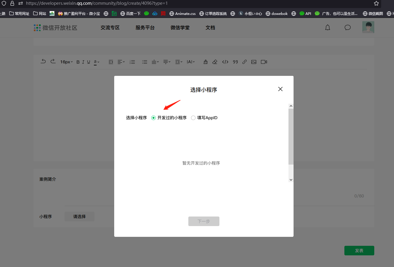 如图,在微信开放社区的个人主页里添加案例的时候,选择小程序那里有个开发过的小程序,我作为开发者的身份提交发布过很多小程序,为什么这里没显示呢?