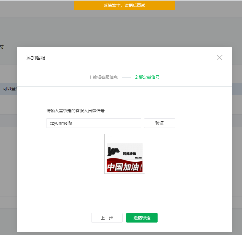 公众号添加客服,老是显示系统繁忙,请稍后重试?
