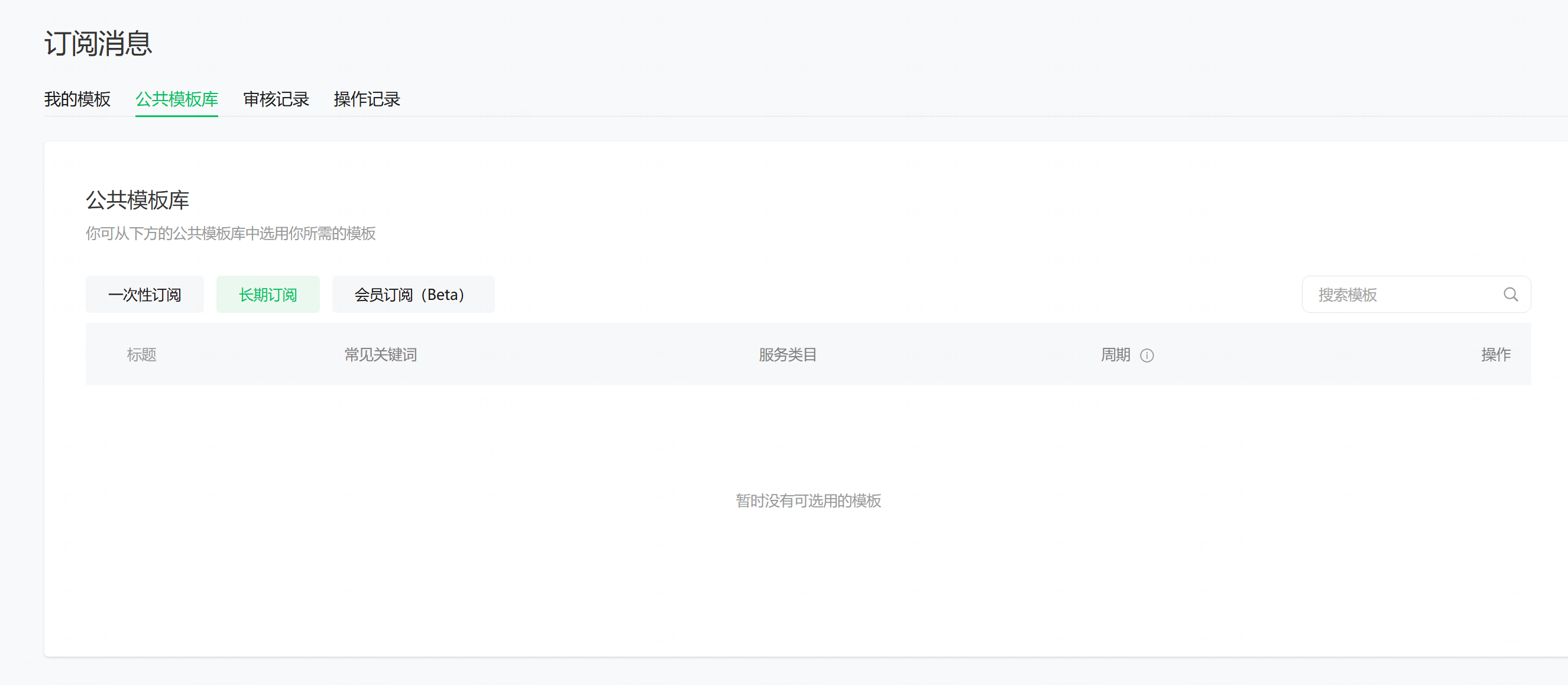 你好,长期订阅消息目前只对政务民生、医疗、交通、金融、教育、设备等部分二级行业类目进行开放,仅支持少量民生公共服务节点通知,并非所有场景都能支持,请谅解。如有新增长期订阅模板需求,可按以下格式提供相关信息帮助评估(注:设备类长期订阅模板需求需先完成「设备接入」);