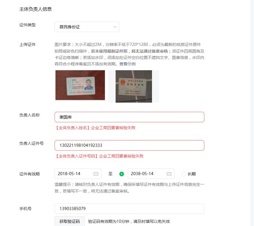 主题负责人信息填写后显示企业工商四要素核验失败。