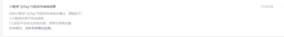 你好,经核实,贵方小程序【分享】-【分享到朋友圈】涉及平台未允许的内容:诱导分享朋友圈,请去掉!