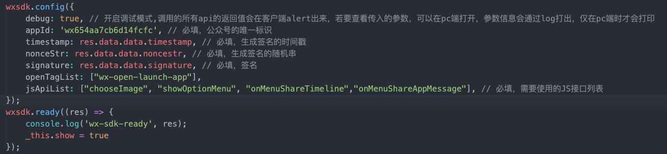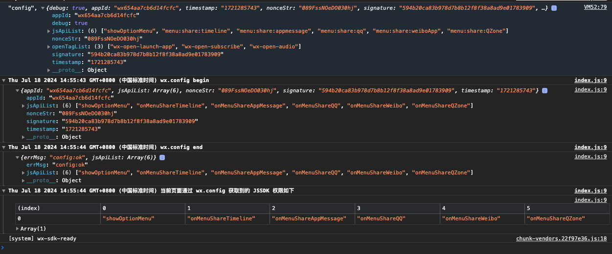 debug: true, // 开启调试模式,调用的所有api的返回值会在客户端alert出来,若要查看传入的参数,可以在pc端打开,参数信息会通过log打出,仅在pc端时才会打印