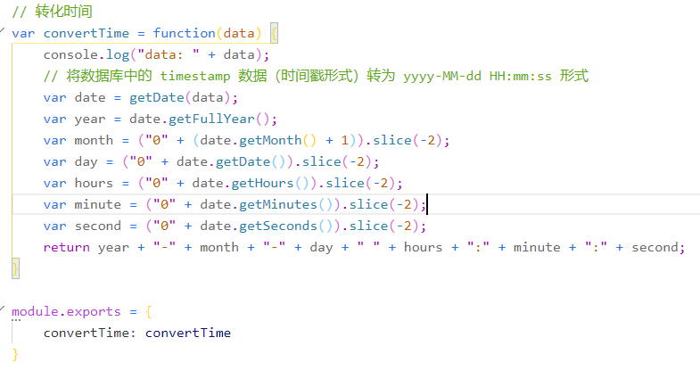 function convertTime(){var stamp = 1637744252var time = getDate(stamp)console.log('test',("0"+time.getFullYear()).slice(-2))console.log('test',("0"+time.getDate()).slice(-2))console.log('test',("0"+time.getHours()).slice(-2))console.log('test',("0"+time.getMinutes()).slice(-2))console.log('test',("0"+time.getSeconds()).slice(-2))console.log('test',time)return time}