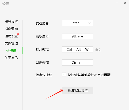 快捷键占用了,检查一下发生问题前装了什么软件导致快捷键被占用,将其设置为空,微信的快捷键即恢复。