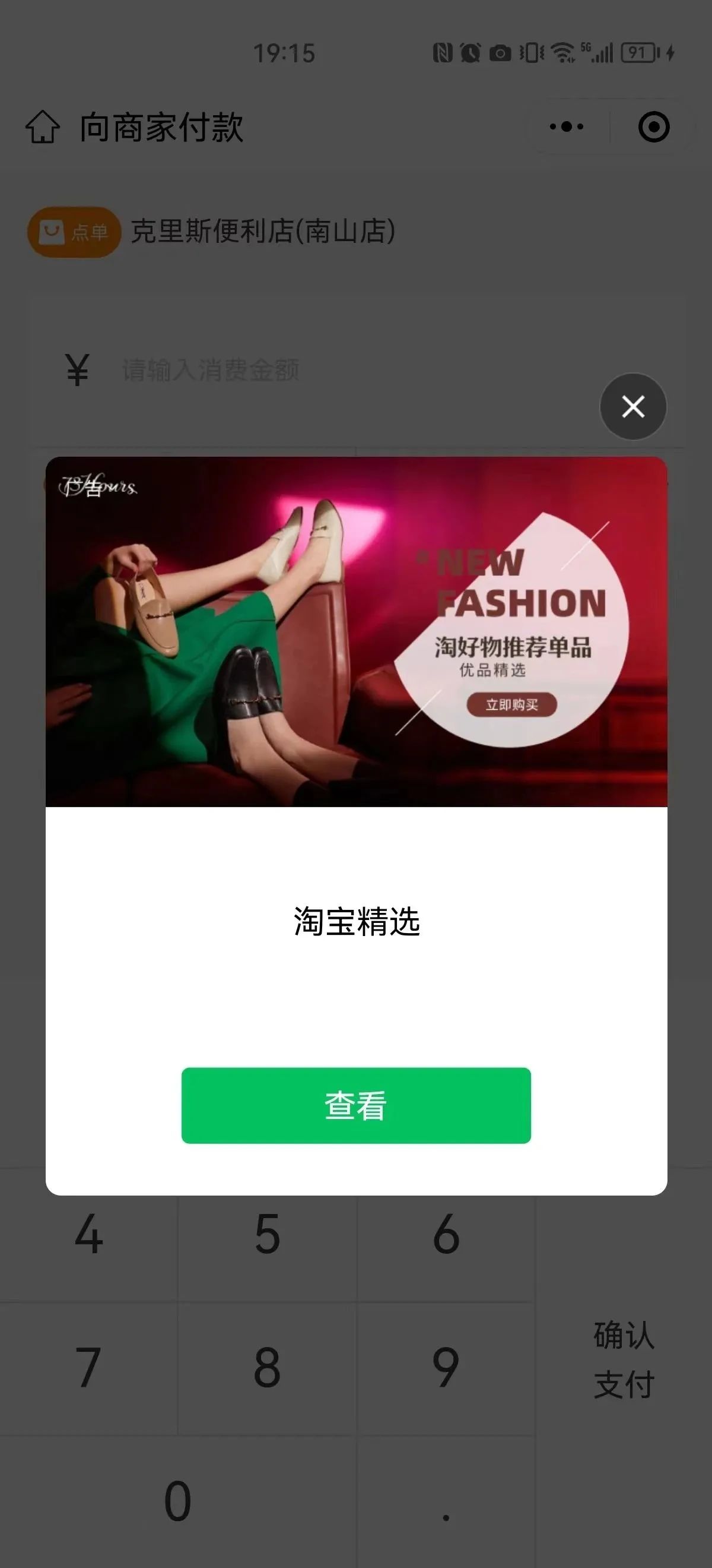 复现步骤:我们是做支付行业的,扫如下二维码进入支付页面,支付成功后跳转到自定义的支付结果页,拉起微信弹屏广告,此时不要退出小程序也不要关闭弹屏广告,小程序切到后台,再次打开微信APP扫支付二维码,此时弹屏广告依然展示在页面中。