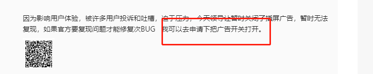 因为影响用户体验,被许多用户投诉和吐槽,迫于压力,今天领导让暂时关闭了插屏广告,暂时无法复现,如果官方要复现问题才能修复次BUG 我可以去申请下把广告开关打开。