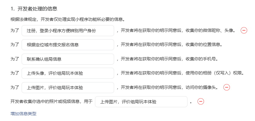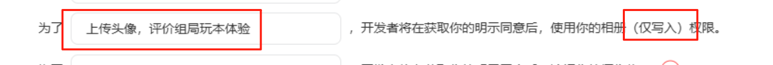 建议自行检查下所填写的描述是否符合对应的隐私接口,特别要注意标有【仅写入】的权限:比如【相册(仅写入)权限】的用途是保存图片或保存视频,是没有发布、上传等功能的哦,建议修改。