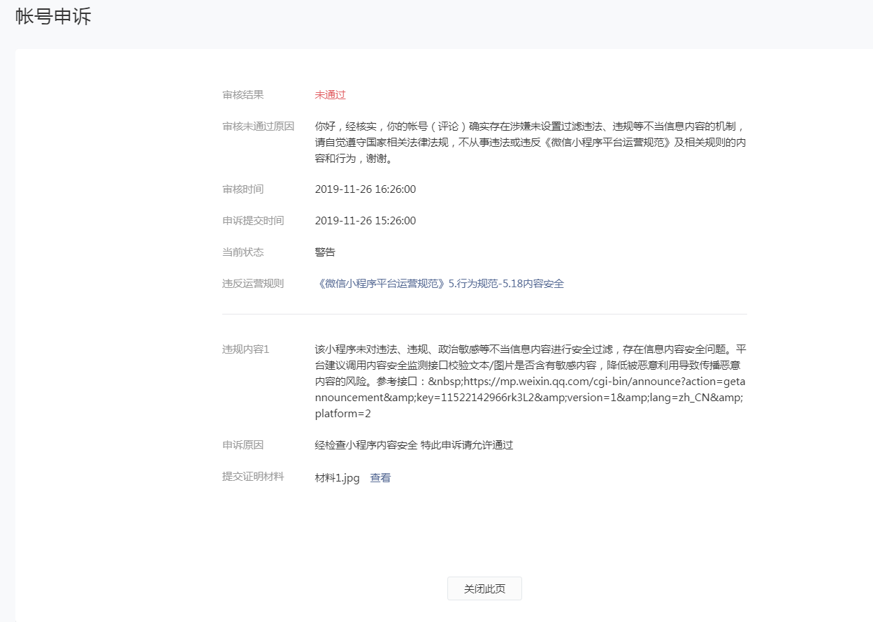 请问下小程序未设置内容信息安全过滤被通知警告,如何进行二次申诉?由于第一次申请失败后,我们按要求进行了积极整改,现在新版本已提交审核通过且发布,但是没有二次申请的入口了,请帮忙处理下。