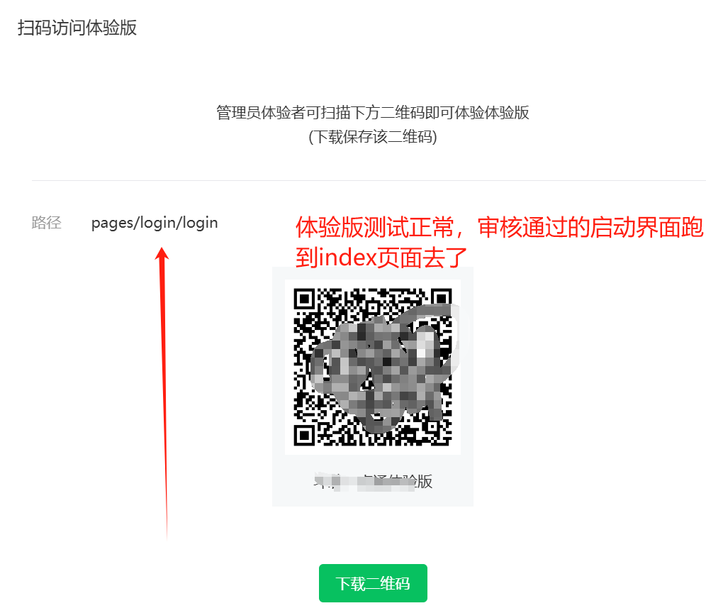 体验测试的启动界面没问题 pages/login/login,通过审核的发布版启动界面在index,求帮助什么情况,手机重启过,换电脑也不行,应该不是手机的问题,头一次遇到,求帮助。