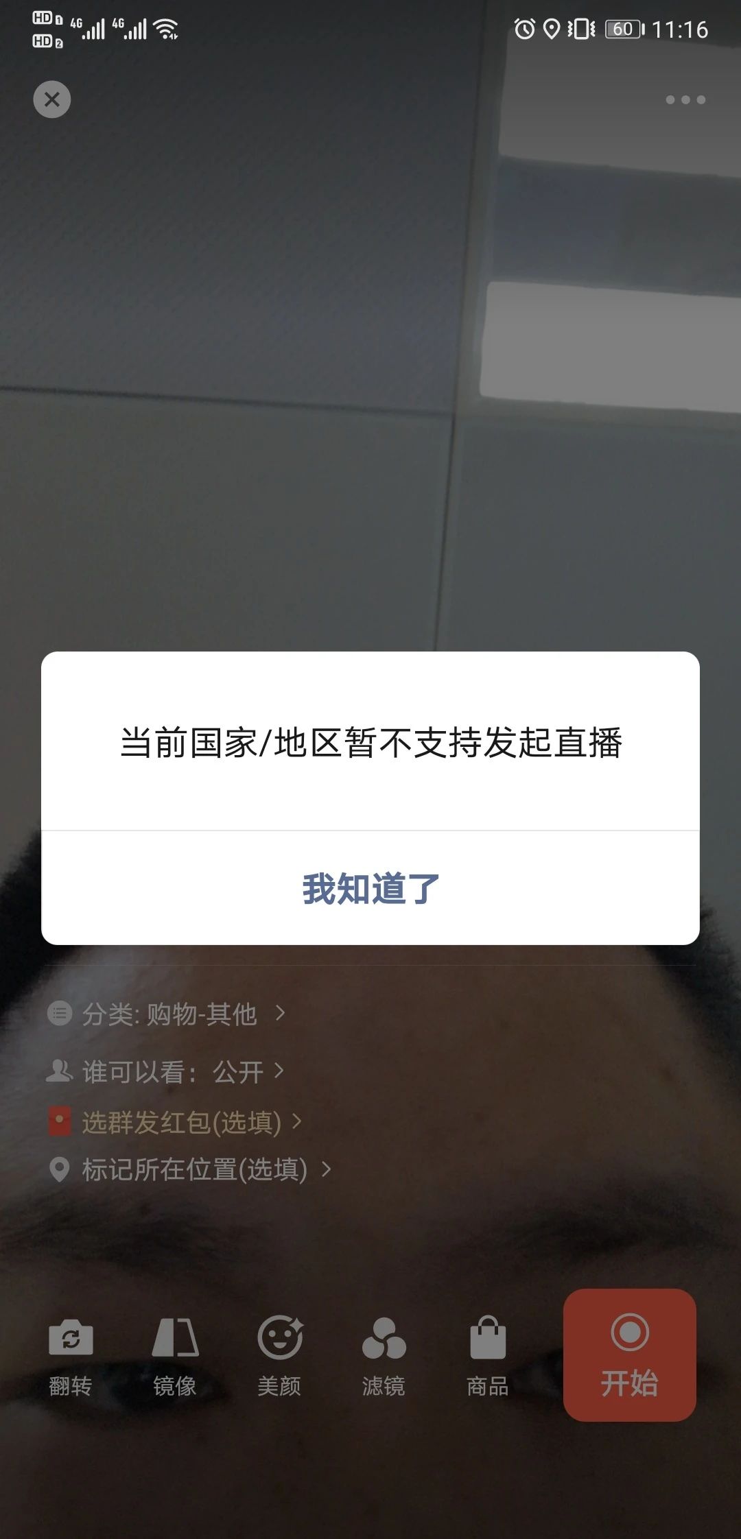 我本人在乌鲁木齐,视频号已经企业认证,并且通过附近的直播,看到本地有人直播,以上 第一个图是通过附近的直播看到的,第二个是进入别人的直播间,跟主播交流,主播就是在吐鲁番,也是在新疆,而我的视频号发起直播的时候就一直提示 当前国家地区暂不支持发起直播,麻烦技术大神给指定一下,具体是哪块出现了问题,我自己搜索了半天,说是更换绑定的手机号可以解决,我自己试了,问题依然在
