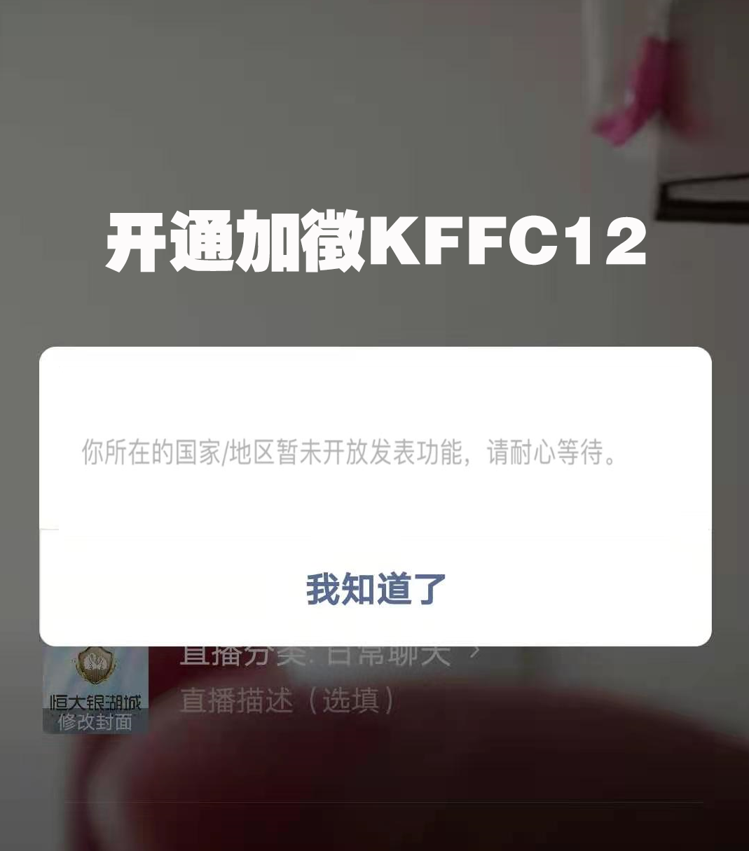 请问 这个问题你解决了吗 是怎么操作的 我也 在内地的时候 随便直播 会乌鲁木齐用乌鲁木齐的手机号注册的微信 结果想的开个游戏直播 321倒计时后显示“不支持直播地区” 你有解决办法吗