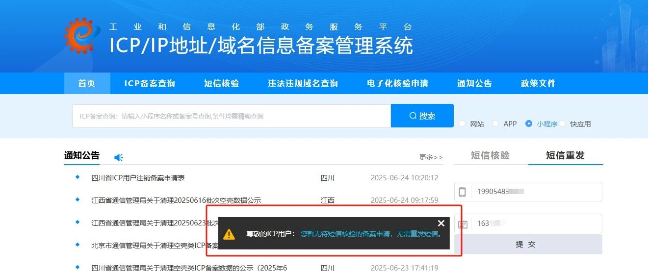 2、关于核验短信问题:需根据备案小程序的实际备案类型、涉及的变更信息或发起对象来判断短信核验对象,详情可参考:https://developers.weixin.qq.com/miniprogram/product/record/sms_verification.html#_9%E3%80%81%E5%A6%82%E4%BD%95%E7%A1%AE%E5%AE%9A%E5%B7%A5%E4%BF%A1%E9%83%A8%E6%A0%A1%E9%AA%8C%E7%9F%AD%E4%BF%A1%E7%9A%84%E6%A0%B8%E9%AA%8C%E5%AF%B9%E8%B1%A1%EF%BC%9F%E6%98%AF%E5%8F%91%E9%80%81%E5%88%B0%E5%B0%8F%E7%A8%8B%E5%BA%8F%E8%B4%9F%E8%B4%A3%E4%BA%BA%E6%89%8B%E6%9C%BA%E8%BF%98%E6%98%AF%E4%B8%BB%E4%BD%93%E8%B4%9F%E8%B4%A3%E4%BA%BA%E6%89%8B%E6%9C%BA%EF%BC%9F