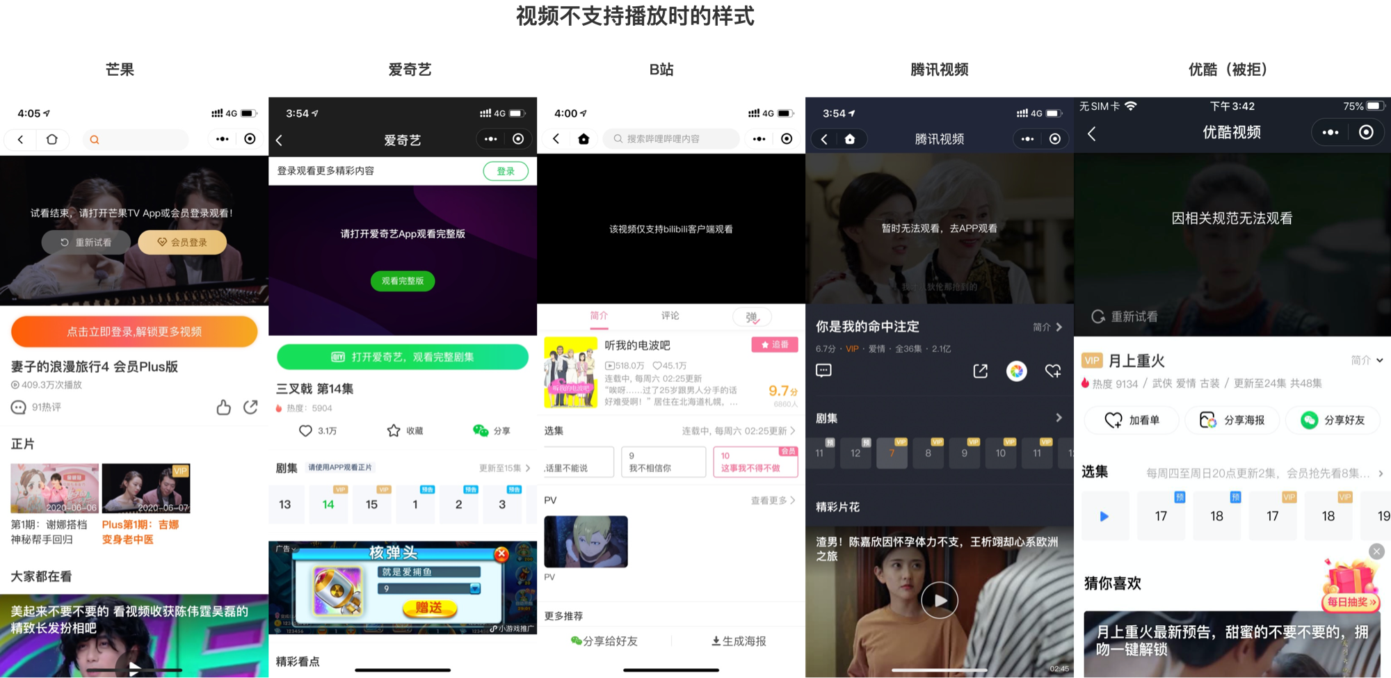 2.目前头部长视频APP在微信小程序上都是有限播并且都存在一定程度上的唤端引导,如下图-最右是优酷,那为何只对优酷要求如此严格