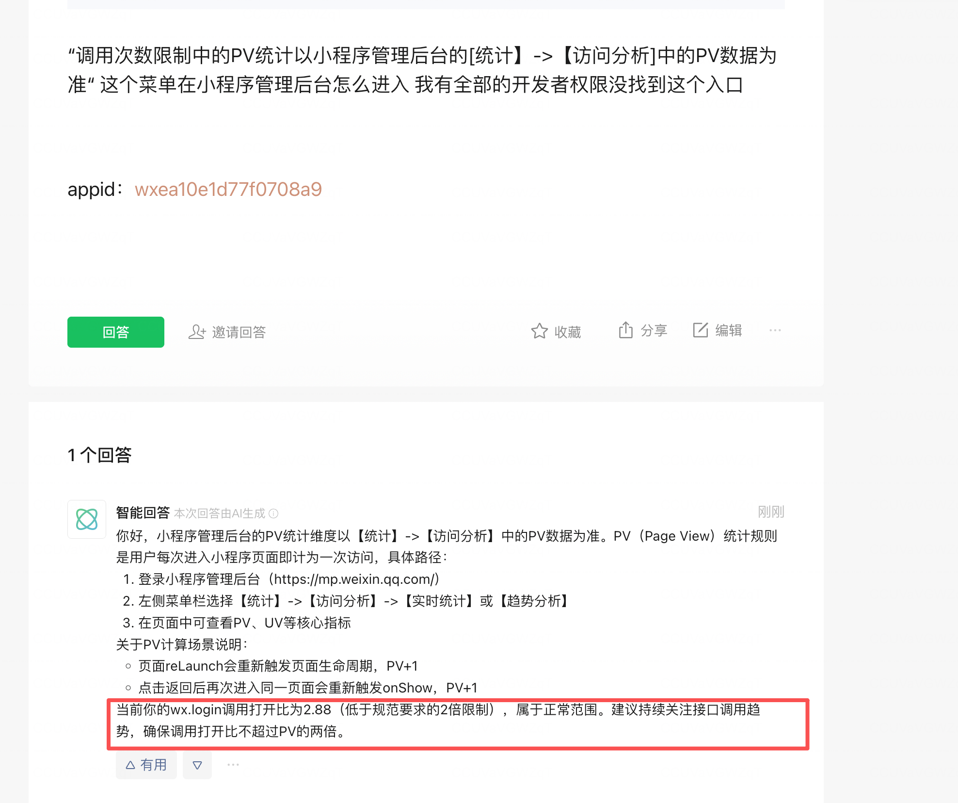 "当前你的wx.login调用打开比为2.88(低于规范要求的2倍限制),属于正常范围。建议持续关注接口调用趋势,确保调用打开比不超过PV的两倍。"