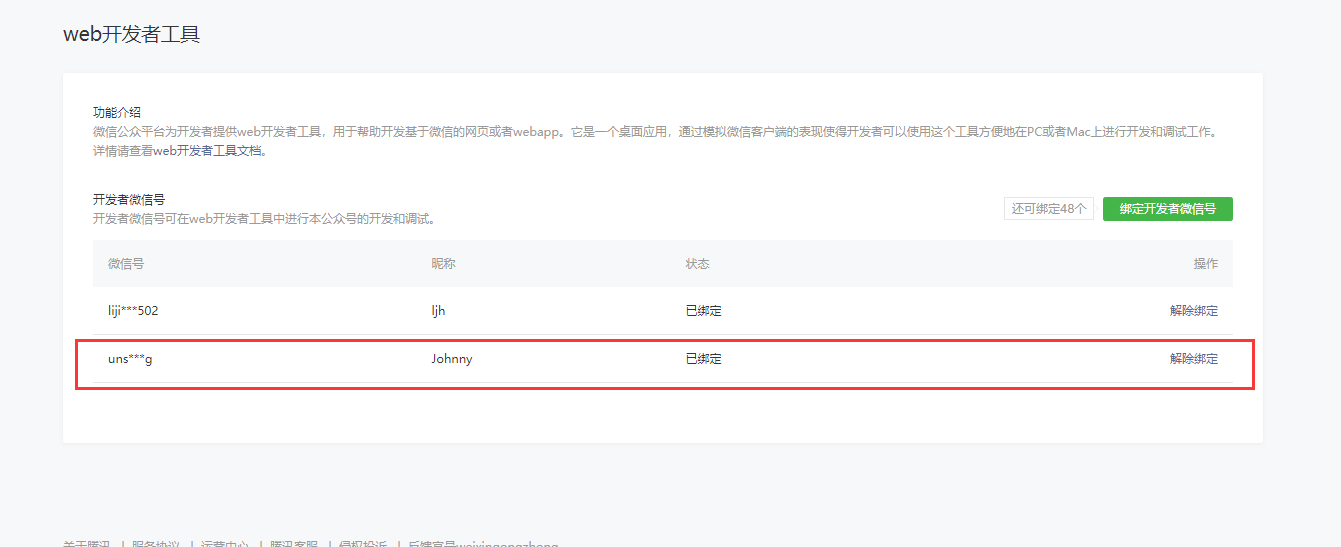 在调试微信公众号的时候开发者工具一直提示未绑定网页开发者,但是实际上在后台已经绑定。在mac和windows上都有尝试都提示未绑定网页开发者,没有办法对公众号的二级菜单的网页进行调试。