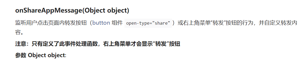 只有定义了此事件处理函数,右上角菜单才会显示“转发”按钮https://developers.weixin.qq.com/miniprogram/dev/reference/api/Page.html#onShareAppMessage-Object-object
