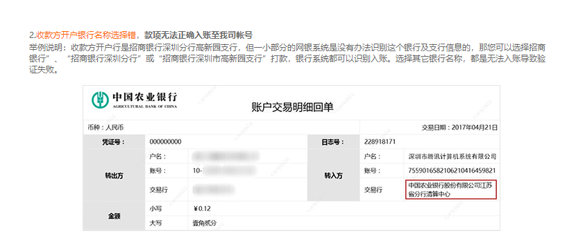 举例说明:收款方开户行是招商银行深圳分行高新园支行,但一小部分的网银系统是没有办法识别这个银行及支行信息的,那您可以选择招商银行”、“招商银行深圳分行”或“招商银行深圳市高新园支行”打款,银行系统都可以识别入账。选择其它银行名称,都是无法入账导致验证失败。