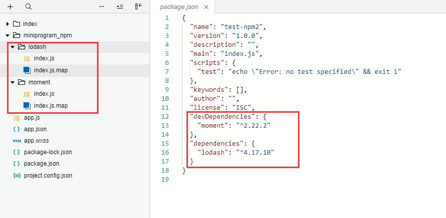 在小程序根目录(dist)下复制项目(project)的package.json,去除相关的devDepenedencies,只保留dependencies