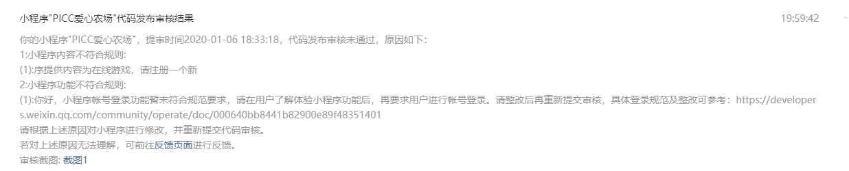 尊敬的审核人员您好,我们的"PICC爱心农场"小程序,是公益小程序,是为了给用户提供一个公益值收集兑换的活动,并没有使用到游戏引擎开发,和游戏也有重大的区别,为什么被认定为在线游戏呢,没有娱乐功能,是为支持偏远山区农民的经济发展做公益的,中国人保不认为公益农场是在线游戏;并且审核的时候认为我们在为让用户了解到小程序的内容时,强制用户登陆/注册,我们在用户使用小程序之前,有页面给用户介绍小程序的核心内容,用户在了解后,可以选择注册与否,请您再次核实,谢谢!!! 提审时间2020-01-06 18:33:18