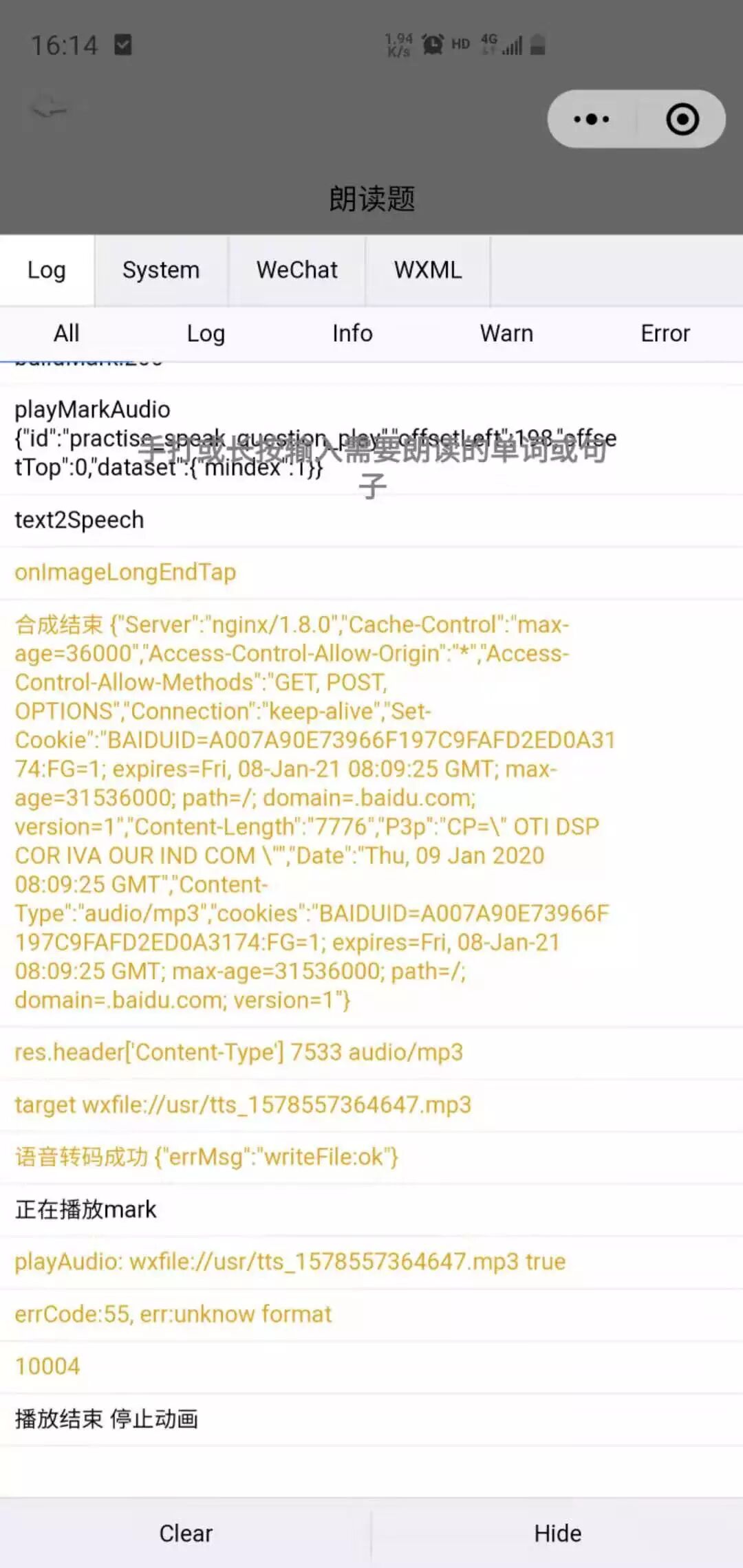 是不是百度语音合成接口?用wx.downloadFile返回的是临时的mp3文件路径,如果你返回的是二进制流,应该是传参有问题,文本要使用encodeURIComponent进行编码。