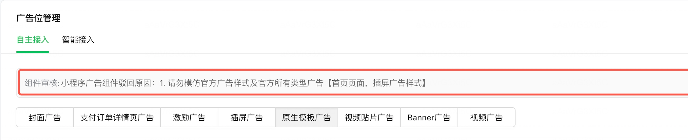 请问这样使用广告组件有违反规定吗?我看我自定义的竖屏广告的样式和官方插屏广告样式也不一样呀。为什么会被驳回呢?
