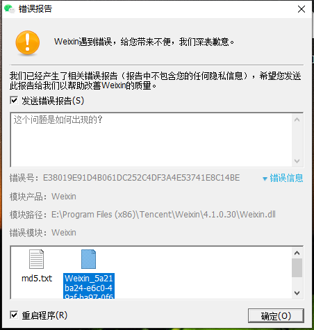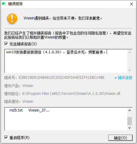 更新最新版微信后(版本:4.1.0.30),登录电脑版微信,登录成功后,微信界面频繁卡死崩溃,试了多次依然是这样。我电脑系统是Win10专业版。