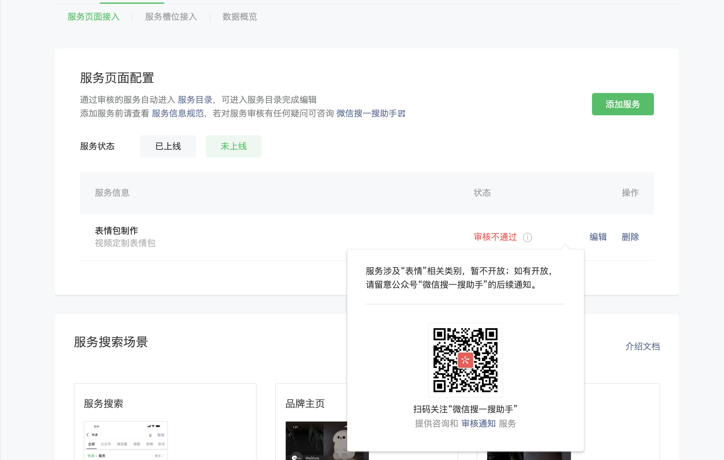 我遇到了一个问题,搜一搜服务页面接入,审核提交了很多次了,都告知我”表情“相关内容不开放。但是我自己在微信里搜索看到明明有表情相关的小程序接入了搜一搜服务页面,还有有好几个,请帮忙解释一下这个是不同审核员标准不一样还是怎么回事儿?
