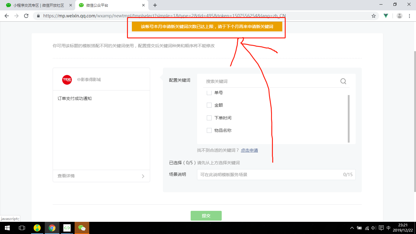 1)订阅消息新增模板每月提交次数10次,新增关键词每月提交次数5次;不保留修改机会,提交成功一次扣除一次申请次数;