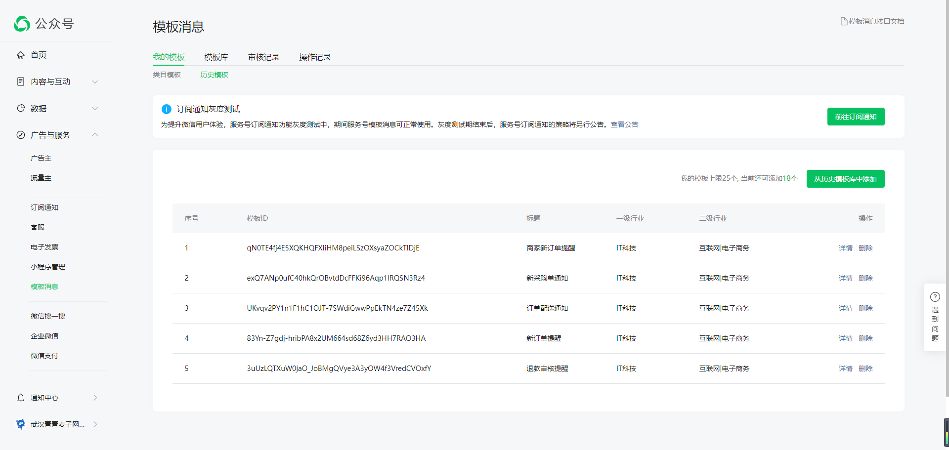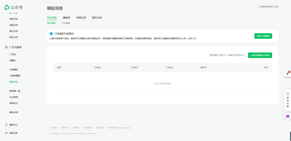 你好,历史模板已经统一下架不支持选用,但不影响历史已添加至私有库的模板正常调用。类目模板没有相关适用模板,可线上提审。可参考以下文档:1、类目模板消息使用说明:https://mp.weixin.qq.com/s/Kx4kDlUgkCCMXCTT-cIkfQ ;2、公众号服务类目:https://developers.weixin.qq.com/doc/offiaccount/Subscription_Messages/category.html
