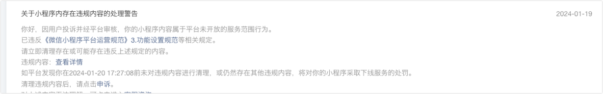 违规情况已通过站内信下发,可在mp后台登录查看详情根据站内信指引完成整改后发起申诉即可。