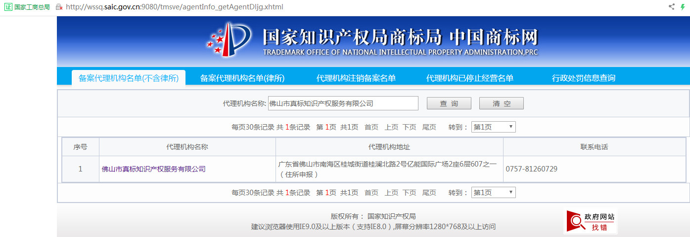 国家商标局网站:(佛山市真标知识产权服务有限公司)http://wssq.saic.gov.cn:9080/tmsve/agentInfo_getAgentDljg.xhtml