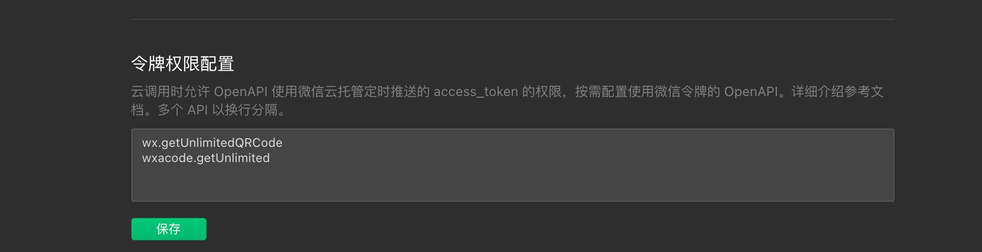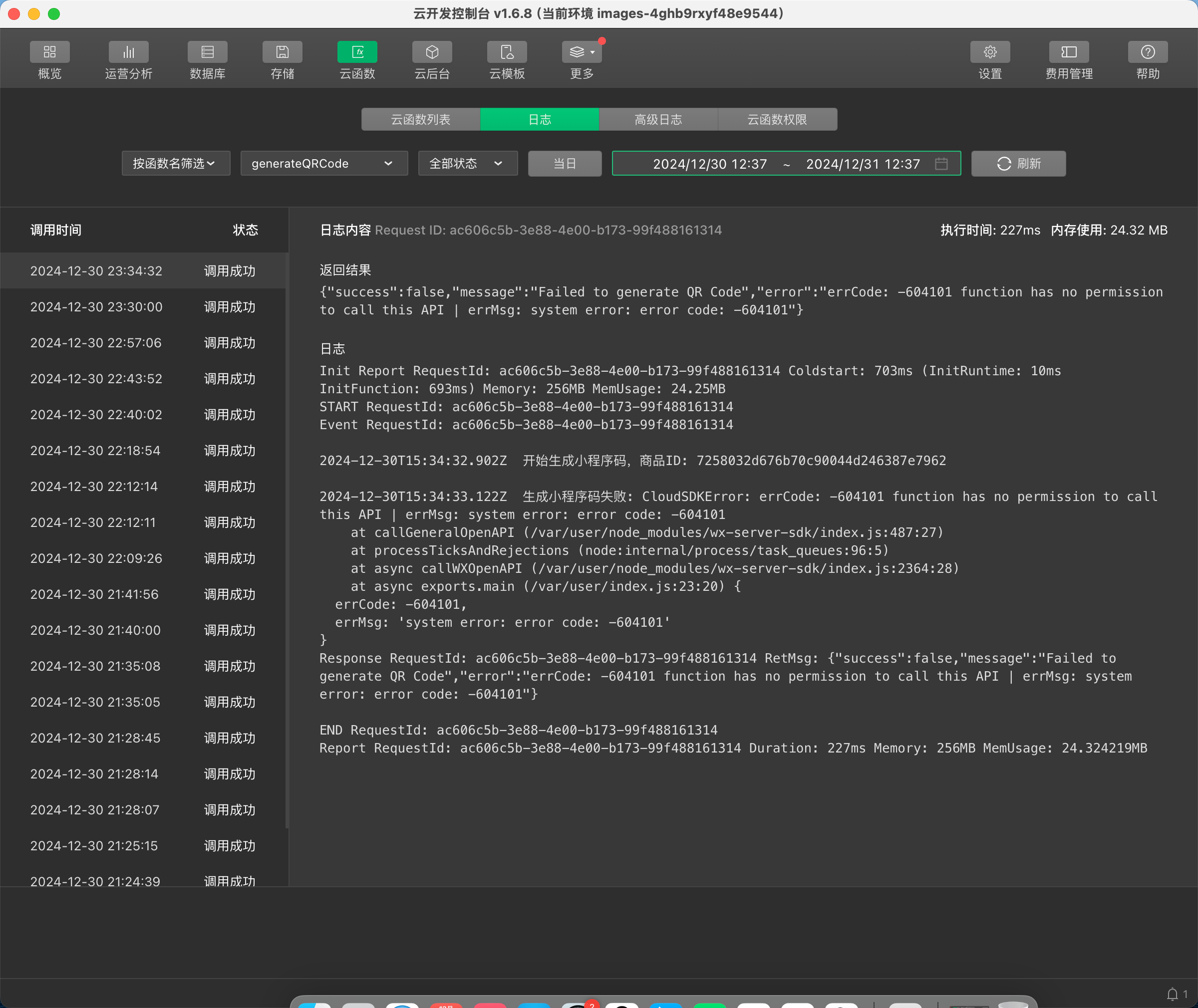 电商小程序,希望在每个商品详情页能够动态生成小程序码,采用了getUnlimitedQRCode接口,但在调用接口的时候总是权限不够,但已经在令牌处保存了设置。 如图是令牌处截图、云函数日志。页面路径配置没有问题、云环境没有问题, 本人不太懂代码,一切工作由ai辅助,求解答这个权限问题应该怎么解决。