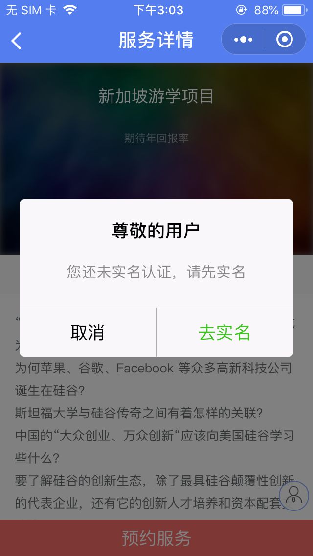 你好,经核实,小程序涉及投资项目的预约服务,且需要实名认证,才能完整体验,若小程序不涉及在线投资服务,建议更改小程序的展示形式,或提供小程序详细的体验截图以证明。![]()