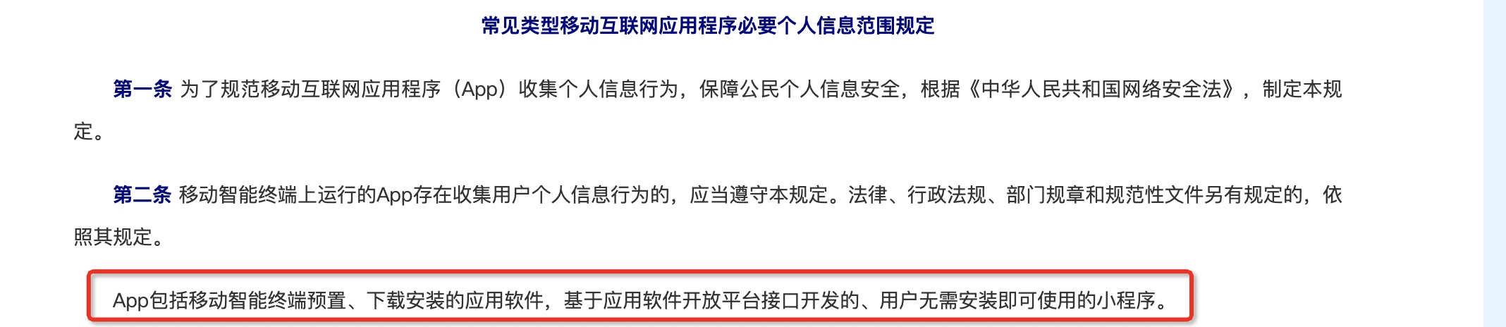 但是在《常见类型移动互联网应用程序必要个人信息范围规定》的表述中,小程序也被纳入了App的范畴内