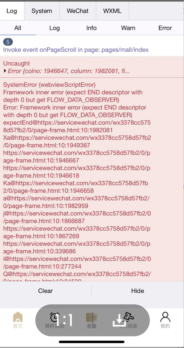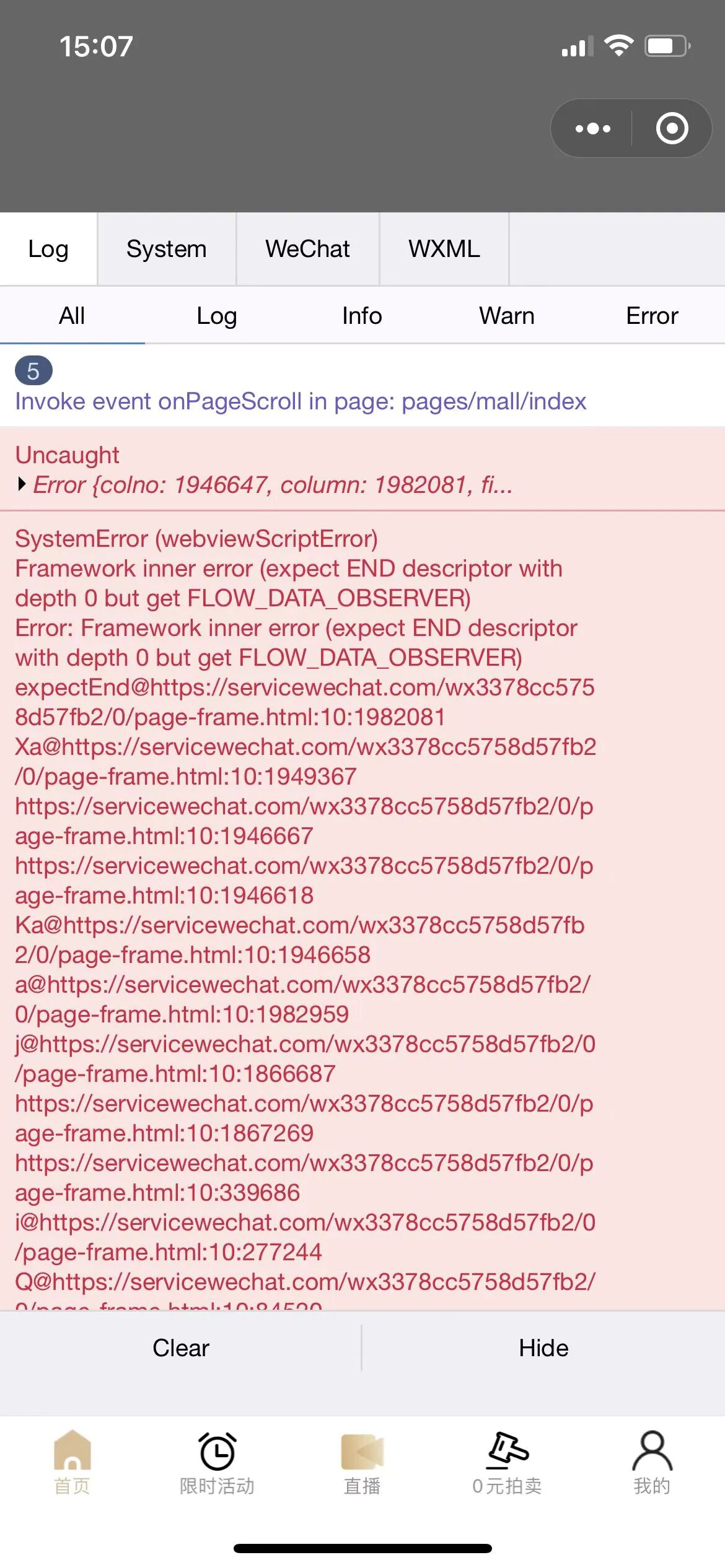 小程序页面加载完成点击底部五个tabBar菜单(原生tabBar),快速重复点击,导致首页大概率白屏崩溃,然后无论下拉刷新还是在点击都无法显示页面,但是接口还是正常请求,麻烦看下什么情况,打印报遗下错误!
