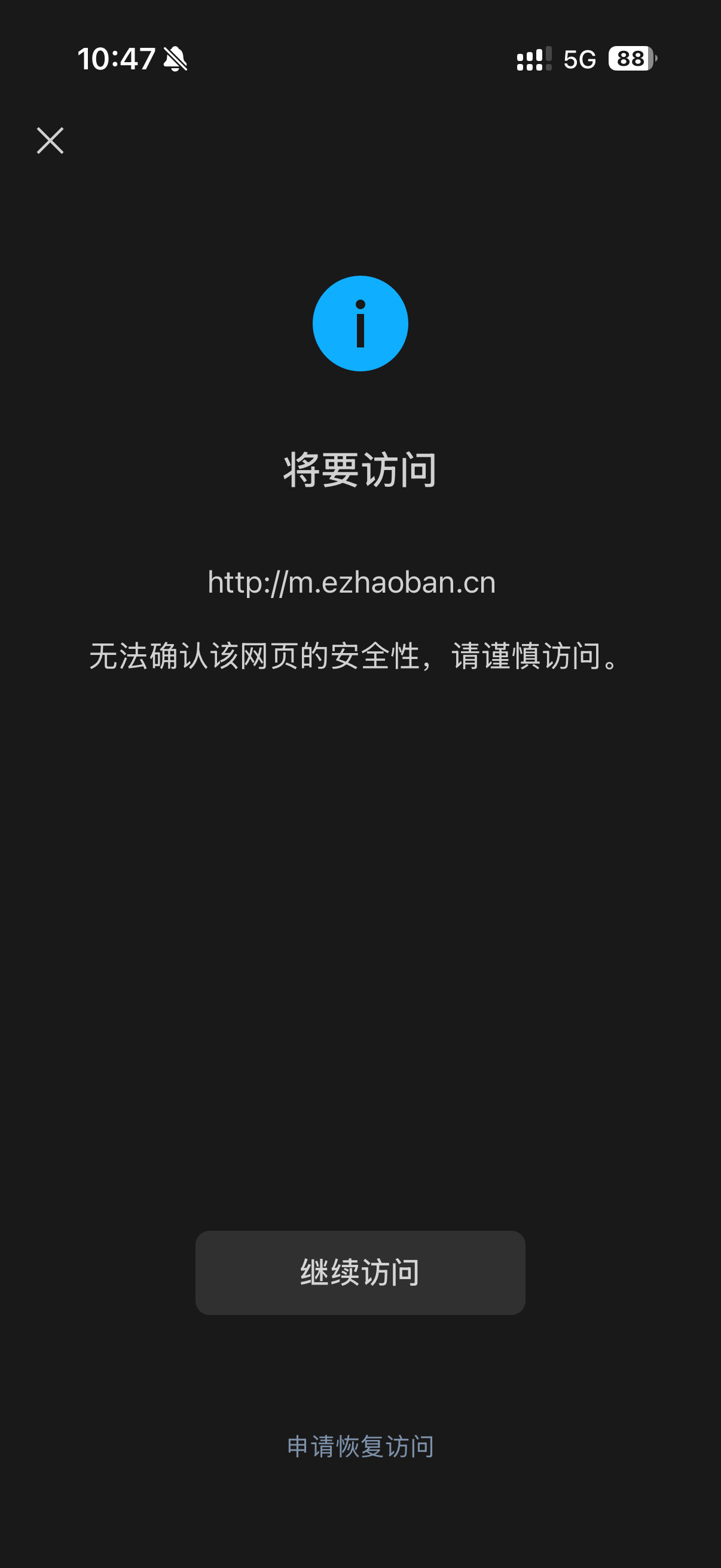 您好,域名ezhaoban.cn在西部数码注册并通过优刻得备案通过,http://m.ezhaoban.cn/浏览器访问正常,我是网站开发者,访问时间如图2026/1/14,点开网址提示“无法确认该网页的安全性,请谨慎访问。”经检查网页里没有不安全的内容,请核实后帮忙解除拦截,谢谢!尽快处理,急急急,现在需要打开使用,谢谢!