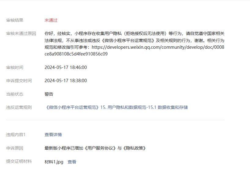 之前由于登录页未加上《用户服务协议》与《隐私政策》被用户投诉后微信把搜索功能给禁用了,现在小程序不能被通过名称搜索到。然后我就发布新的小程序加上了《用户服务协议》与《隐私政策》,申诉还是失败了,这是为什么?