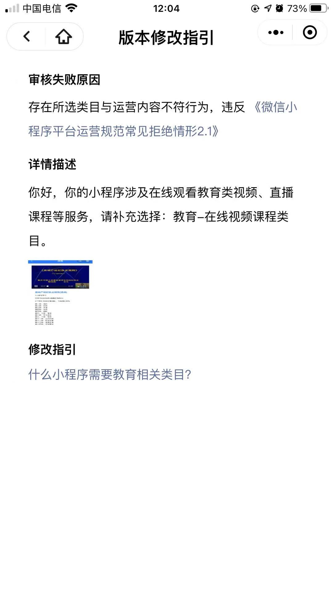 你好,我的小程序打包上架被拒了,原因是我们这个小程序里包含了教育类课程,我们是一个房地产评估协会,免费给评估师提供的教育类视频,不属于其中的任何分类,请问要怎么解决啊?