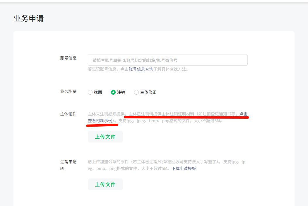 主体注销的账号,上传主体注销证明材料注销。https://mp.weixin.qq.com/webpoc/accountBack
