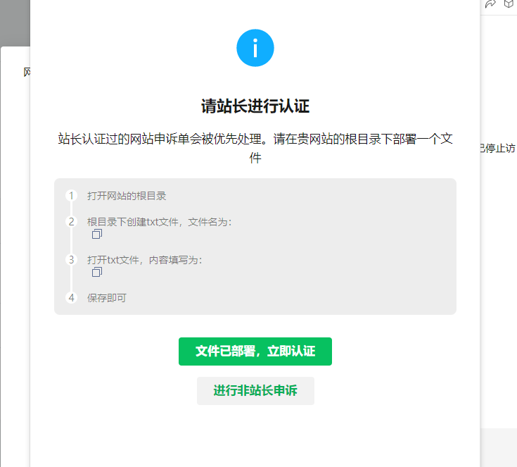 微信中停止访问网页,申请恢复访问的时候选择了“网站站长”身份,提示到下面内容,文件名跟文件内容都没有提供,点击那个小图标也没有出现复制啥的,这个要怎么处理啊?