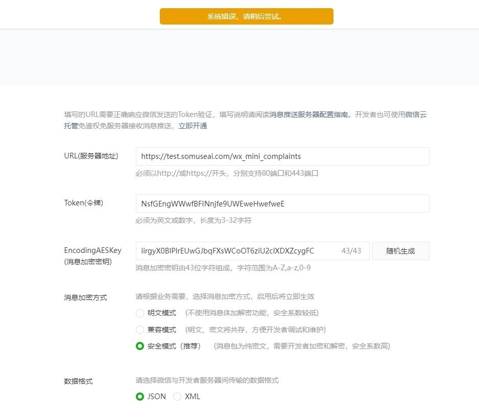 消息推送无法开通,系统错误,换了电脑换了浏览器都不行,好几天了都不行