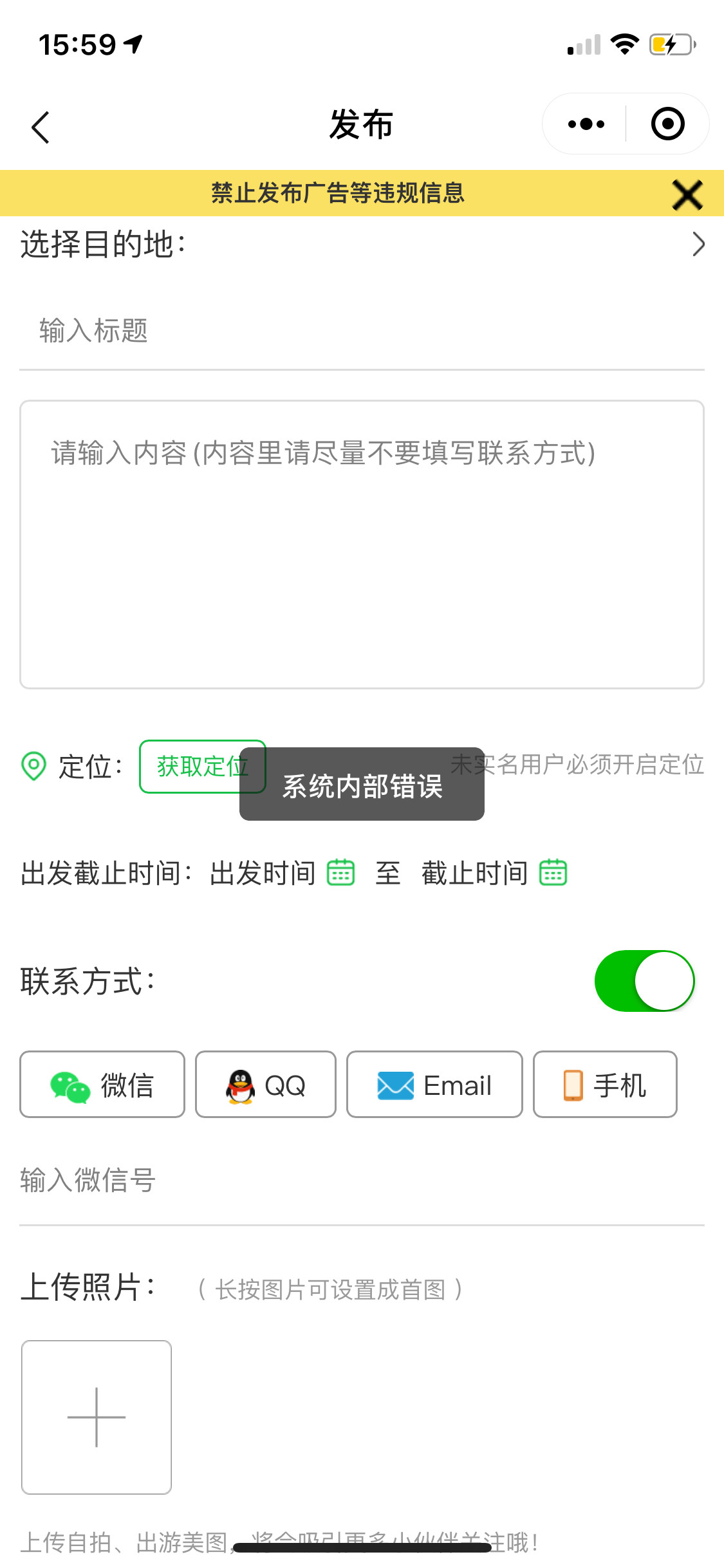 有海外用户(意大利)反馈,在发布里上传图片,总是显示:系统内部错误 无法上传,国内可以正常上传图片