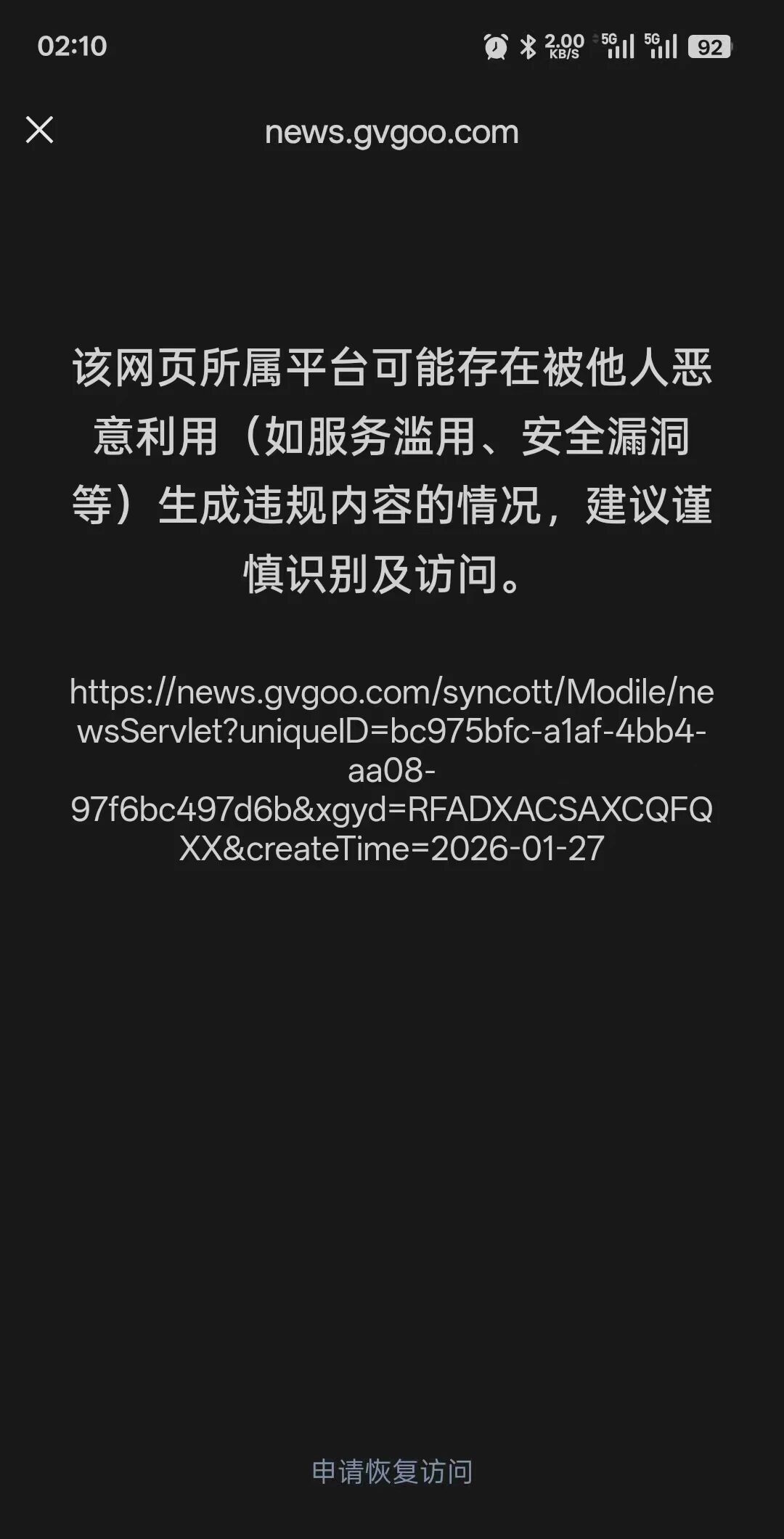你好,经核实,域名gvgoo.com 下的链接【http://lyybht.gvgoo.com/?Ni=kVl8jffFvG15t8tZExz7SQzsDmJ6aKEF】的内容存在违反《微信外部链接内容管理规范》的第3.2条“恶意违规类内容”,现经核实相关违规内容已修改,现予已恢复微信内直接访问的服务,另核实该域名存在安全漏洞,建议修复相关漏洞,避免再次违规,请知悉。详细规则请参考《微信外部链接内容管理规范》http://weixin.qq.com/cgi-bin/readtemplate?t=weixin_external_links_content_management_specification