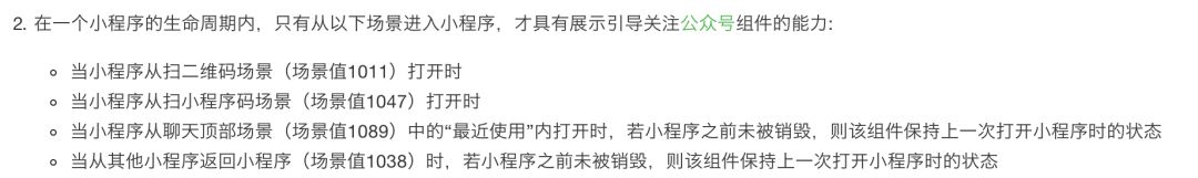 但是小程序后台运行关掉了再从最近使用的程序中点击打开,此时的场景值还是1089 但是这个公众号引流组件就是不显示出来。诧异,请问怎么解决