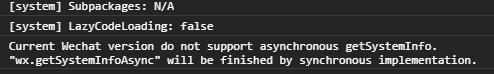 Current Wechat version do not support asynchronous getSystemInfo. "wx.getSystemInfoAsync" will be finished by synchronous implementation.
