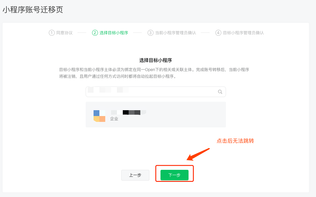小程序账号迁移,第一次走到第四步,管理员扫码时,提示二维码过期。重新执行流程,走到第二步,无法进行下一步。
