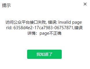 访问公众平台接口失败, 错误: invalid page rid: 6358d461-49093ff0-3158f303,错误详情:page不正确
