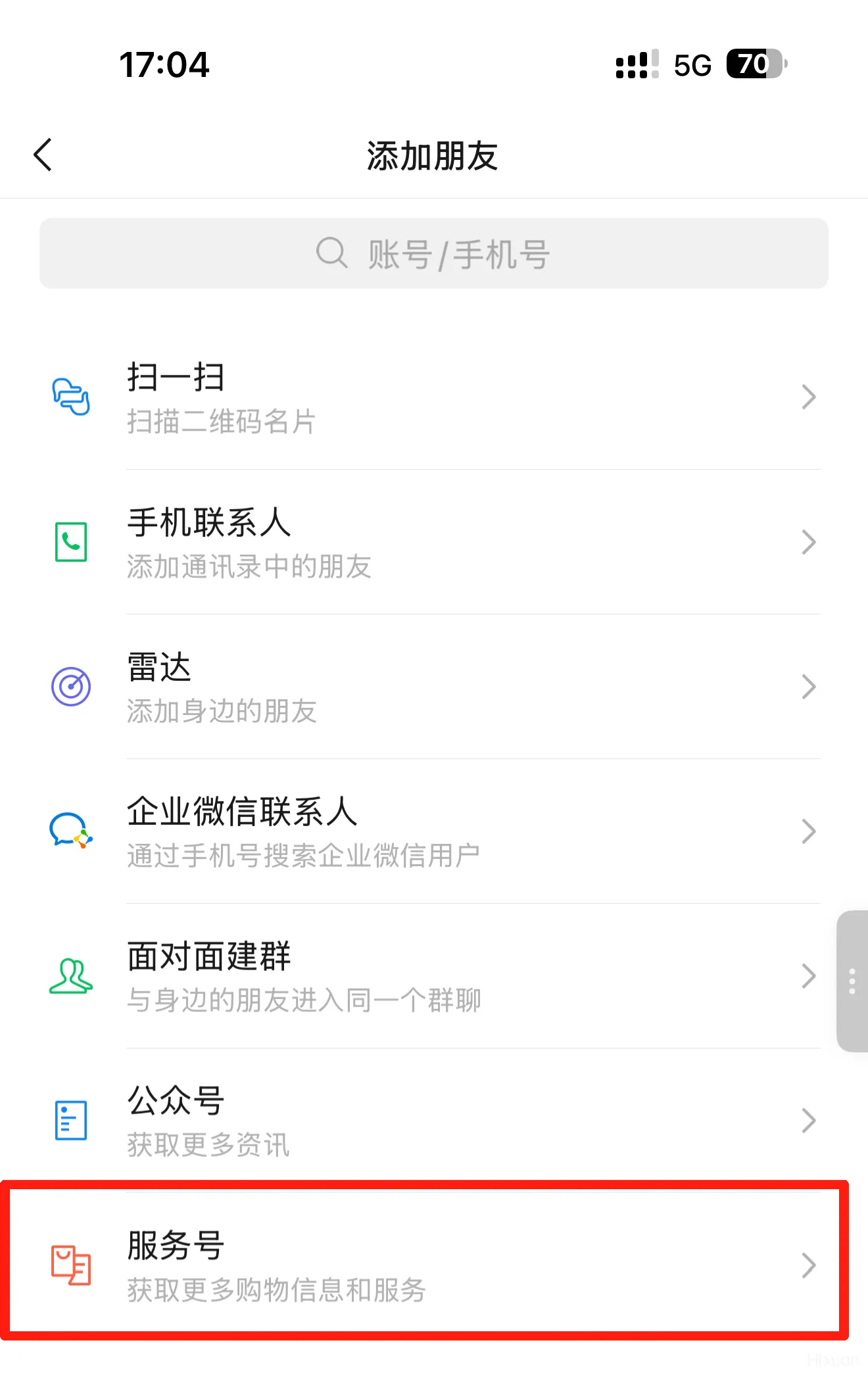 需要注意的是,你的账号类型是【服务号】,若是在添加朋友这里搜索,要选择【服务号】才能搜索到,选择【公众号】是搜不到的。