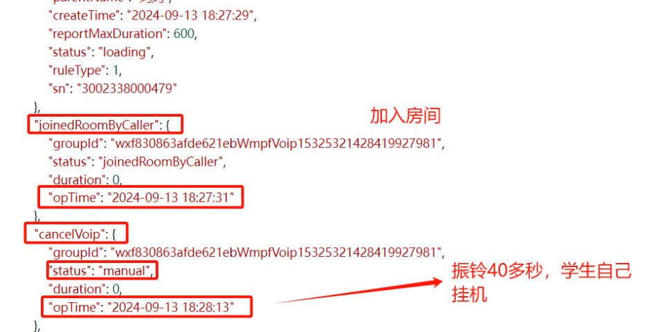 学生打微信电话给家长,家长手机型号为苹果12,息屏状态没有强提醒,学生等待40多秒无人接听点击界面挂断按钮取消通话。(家长已上传微信9月13日日志)