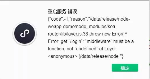 智能上传报错 {"code":-1,"reason":"/data/release/node-weapp-demo/node_modules/koa-router/lib/layer.js:38\n throw new Error(\n ^\n\nError: get `/login`: `middleware` must be a function, not `undefined`\n at Layer.<anonymous> (/d"}